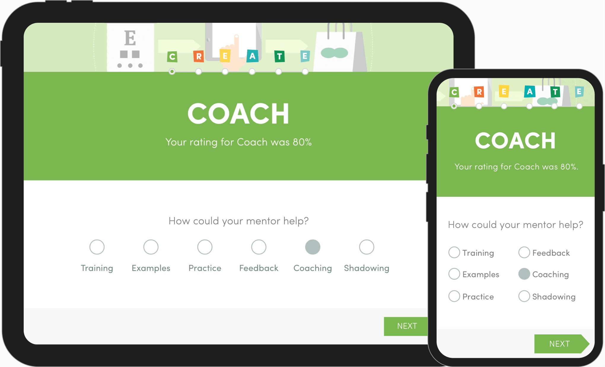 It features 2 modes: Team member and Mentor. Support material was available contextually for both modes throughout the app, including videos, scenarios and comprehensive coaching documentation.