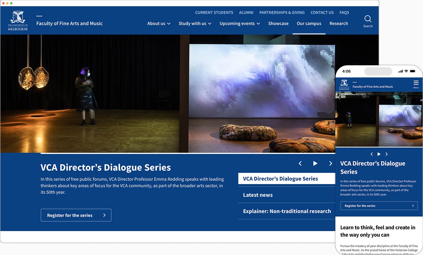 In 2019, the Faculty of Fine Arts and Music initiated a website consolidation and re-design project to bring their various school, centre, gallery and publication websites under a single domain and information architecture using the University's design system.